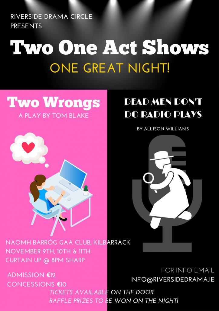 RIVERSIDE DRAMA CIRCLE WILL PRESENT TWO ONE ACT PLAYS ON WEDNESDAY, THURSDAY AND FRIDAY – 9TH, 10TH AND 11TH NOVEMBER 2022 IN NAOMH BARROG GAA CLUB, KILBARRACK. CURTAIN UP AT 8.00 PM SHARP.