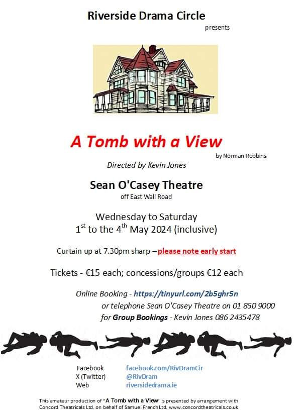 Riverside Drama Circle is ready to move into the Seán O’Casey Theatre from next Monday, 29th April 2024, to start work on the set for our major Spring production of ‘A Tomb with a View’. Curtain up from Wednesday 1st May for 4 nights.